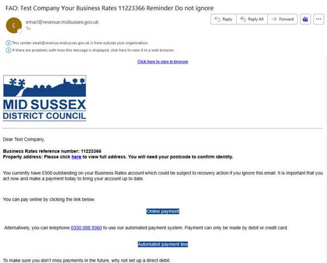 If we send you an email, it will be sent from ‘email@revenue.midsussex.gov.uk’. It will include your name, as it appears on your Business Rates bill, and will detail your outstanding Business Rates payment(s). The email will provide you with links to be able to make payment, via both our automated payment line, and our website. It will also provide you contact details should you wish to discuss your outstanding payment(s):