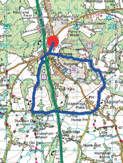 - Walk on toward the church and then turn left to follow Staplefield Road for just over one mile. It is a quiet country road but there is no pavement so take care and keep to the right-hand side to face the oncoming traffic.